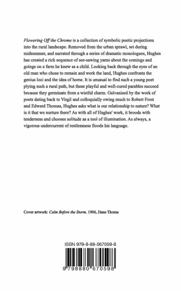 Flowering Off the Chrome is a collection of symbolic poetic projections into the rural landscape. Removed from the urban sprawl, set during midsummer, and narrated through a series of dramatic monologues, Hughes has created a rich sequence of see-sawing yarns about the comings and goings on a farm he knew as a child. Looking back through the eyes of an old man who chose to remain and work the land, Hughes confronts the genius loci and the idea of home. It is unusual to find such a young poet plying such a rural path, but these playful and well-cured parables succeed because they germinate from a wistful charm. Galvanised by the work of poets dating back to Virgil and colloquially owing much to Robert Frost and Edward Thomas, Hughes asks what is our relationship to nature? What is it that we nurture there? As with all of Hughes' work, it broods with tenderness and chooses solitude as a tool of illumination. As always, a vigorous undercurrent of restlessness floods his language.