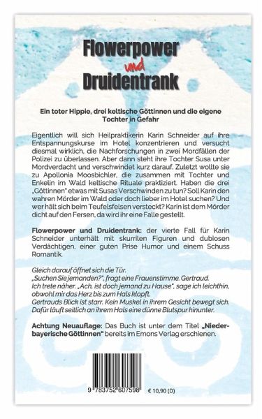 „Flowerpower und Druidentrank“ ist der Titel einer Neuauflage von „Niederbayerische Göttinnen“ von Ingrid Werner geschrieben. Dies ist bereits der vierte Fall für Heilpraktikerin und Hobbydetektivin Karin Schneider, die ihre Nase gerne überall reinsteckt, auch wenn es sie eigentlich nichts angeht. Man kann die Bücher und Fälle rund um Karin Schneider sehr gut getrennt voneinander lesen, da die Fälle in sich geschlossen sind. Die vorherigen Band habe ich jedoch erst kurz davor gelesen und war daher schon sehr gespannt auf den vierten Band.