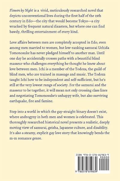 Flowers by Night is a vivid, meticulously researched novel that depicts unconventional lives during the first half of the 19th century in Edo-the city that would become Tokyo-a city wracked by frequent natural disasters, but where one can find bawdy, thrilling entertainment of every kind. Love affairs between men are completely accepted in Edo, even among men married to women, but low-ranking samurai Uchida Tomonosuke has never pledged himself to another man. Until one day he accidentally crosses paths with a beautiful blind masseur who challenges everything he thought he knew about love between men. Ichi is a member of the Todoza, the guild of blind men, who are trained in massage and music. The Todoza taught Ichi how to be independent and self-sufficient, but he's still at the very lowest rungs of society. For the samurai and the masseur to be together, it will mean not only crossing class lines and negotiating Tomonosuke's unhappy wife, but also surviving earthquake, fire and famine. Step into a world in which the gay-straight binary doesn't exist, where androgyny in both men and women is celebrated. This thoroughly researched historical novel presents a realistic, deeply moving view of samurai, geisha, Japanese culture, and disability. It's also a steamy, explicit gay love story that knowingly bends the m-m romance genre.
