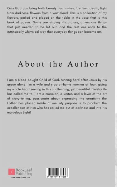 Only God can bring forth beauty from ashes, life from death, light from darkness, flowers from a wasteland. This is a collection of my flowers, picked and placed on the table in the vase that is this book of poems. Some are singing His praises, others are things that just needed to be let out, and the rest are nods to the intrinsically whimsical way that everyday things can become art.