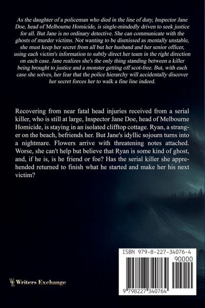 Recovering from near fatal head injuries received from a serial killer, who is still at large, Inspector Jane Doe, head of Melbourne Homicide, is staying in an isolated clifftop cottage. Ryan, a stranger on the beach, befriends her. But Jane's idyllic sojourn turns into a nightmare. Flowers arrive with threatening notes attached. Worse, she can't help but believe that Ryan is some kind of ghost, and, if he is, is he friend or foe? Has the serial killer she apprehended returned to finish what he started and make her his next victim?