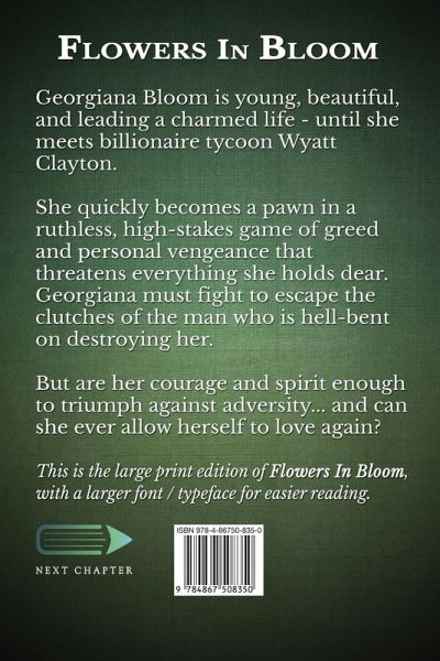 Georgiana Bloom is young, beautiful, and leading a charmed life - until she meets billionaire tycoon Wyatt Clayton. She quickly becomes a pawn in a ruthless, high-stakes game of greed and personal vengeance that threatens everything she holds dear. Georgiana must fight to escape the clutches of the man who is hell-bent on destroying her. But are her courage and spirit enough to triumph against adversity... and can she ever allow herself to love again? This is the large print edition of Flowers In Bloom, with a larger font / typeface for easier reading.