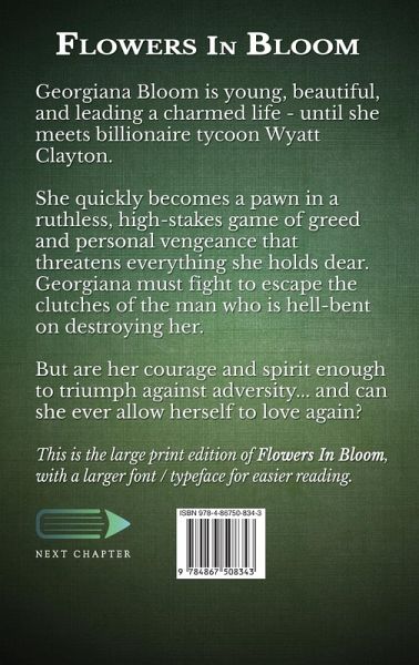 Georgiana Bloom is young, beautiful, and leading a charmed life - until she meets billionaire tycoon Wyatt Clayton. She quickly becomes a pawn in a ruthless, high-stakes game of greed and personal vengeance that threatens everything she holds dear. Georgiana must fight to escape the clutches of the man who is hell-bent on destroying her. But are her courage and spirit enough to triumph against adversity... and can she ever allow herself to love again? This is the large print edition of Flowers In Bloom, with a larger font / typeface for easier reading.