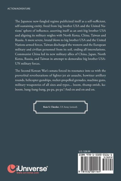 The Japanese new-fangled regime publicized itself as a self-sufficient, self-sustaining entity, freed from big brother USA and the United Nations’ sphere of influence, asserting itself as an anti-big brother USA and aligning its military mights with North Korea, China, Taiwan and Russia. A more severe, brutal blows to big brother USA and the United Nations armed forces, Taiwan discharged the western and the European military and civilian personnel from its soil, ending all interrelations. Communist China led its new military allies of China, Japan, North Korea, Russia, and Taiwan in attempt to demoralize big brother USA-UN military forces. The Second Korean War’s sonata forced its resonance into us with the proverbial reverberations of fighter jet air assaults, howitzer artillery rounds, helicopter gunships, rocket-propelled grenades, machine guns, military weaponries of all sizes and types... boom, thump-swish, ka-boom, bang-bang-bang, pa-pa, pa-pa ! And on and on and on.