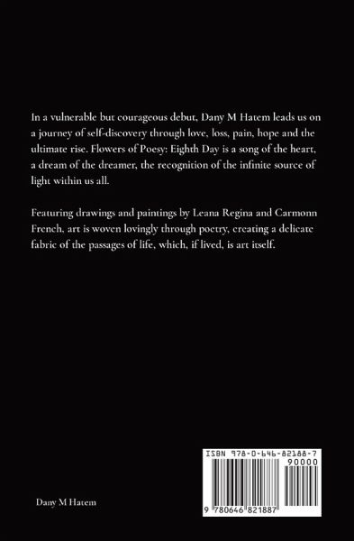 In a vulnerable but courageous debut, Dany M Hatem leads us on a journey of self-discovery through love, loss, pain, hope and the ultimate rise. Flowers of Poesy: Eighth Day is a song of the heart, a dream of the dreamer, the recognition of the infinite source of light within us all. Featuring drawings and paintings by Leana Regina and Carmonn French, art is woven lovingly through poetry, creating a delicate fabric of the passages of life, which, if lived, is art itself.