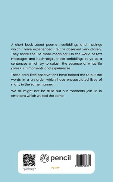 A short book about poems , scribblings and musings which I have experienced , felt or observed very closely. They make the life more meaningful.In the world of text messages and hash-tags , these scribblings serve as a sentences which try to splash the essence of what life gives us in moments and experiences. These daily little observations have helped me to put the words in a an order which have encapsulated lives of many in the same manner . We all might not be alike but our moments join us in emotions which we feel the same.