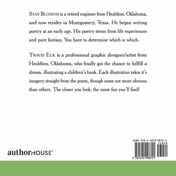 The poems in this book are for the young and the young at heart. Some poems are pure silliness for the youngest readers such as Paul's Little Sandbox, others poems deal with the surprises we encountered while raising our children as seen in Forever Grateful. Some poems were real events taken from my youth, others are pure fantasy. You will have to determine which is which. Travis Eck did a masterful job of creatively drawing your attention to each poem with his clever artwork interpretation. We hope you enjoy reading this book as much as we enjoyed creating it.