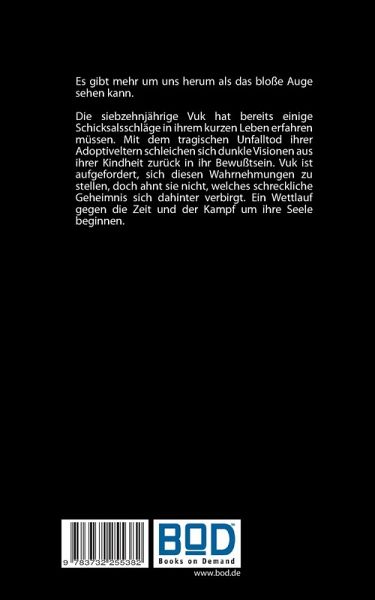 Es gibt mehr um uns herum als das bloße Auge sehen kann.Die siebzehnjährige Vuk hat bereits einige Schicksalsschläge in ihrem kurzen Leben erfahren müssen. Mit dem tragischen Unfalltod ihrer Adoptiveltern schleichen sich dunkle Visionen aus ihrer Kindheit zurück in ihr Bewusstsein. Vuk ist aufgefordert, sich diesen Wahrnehmungen zu stellen, doch ahnt sie nicht, welches schreckliche Geheimnis sich dahinter verbirgt. Ein Wettlauf gegen die Zeit und der Kampf um ihre Seele beginnen.