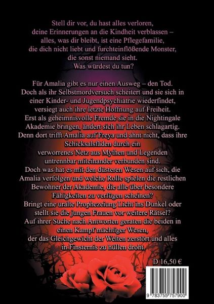 Das Buch ist…mehrAmalia hält das Leben bei ihrer furchtbaren Pflegefamilie und die Visionen von Monstern nicht mehr aus und beschließt Selbstmord zu begehen. Doch dieser schlägt fehl und sie landet in einer Jugendpsychatrie. Dort wird sie von geheimnisvollen Fremden entdeckt und in die Nightingale Akademie gebracht, wo sie lernt, dass die Monster real sind und es Menschen gibt, die diese bekämpfen.