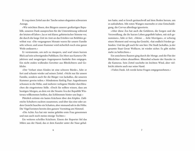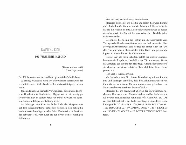 Auch dauerte es ein wenig, bis das Abenteuer meines Lebens an der Seite von Morrigan Crow, Fenstra, Hawthrowne und Jupiter North so richtig Wellen schlug. Jene, die einen unerbittlich mit sich zehren und immer wieder in neue Gefahren bringen, aber auch traumhaft schöne Momente, voller Lebendigkeit, Freude und Euphorie. Die Gestaltung der Charaktere ist ebenso kunterbunt, leicht skurril und verrückt, wie es diese Welt ist. Ich kam aus dem Staunen nicht mehr raus und gewann neue Freunde, in denen das Leben sich in all seinen Facetten zeigte. Womit eine emotionale Achterbahnfahrt garantiert war und auch diese ließ mich nicht mehr los.