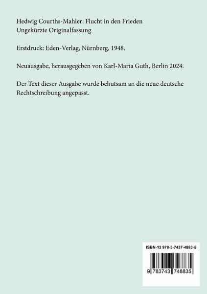 Hedwig Courths-Mahler: Flucht in den Frieden. Ungekürzte Originalfassung Erstdruck: Eden-Verlag, Nürnberg, 1948. Neuausgabe, herausgegeben von Karl-Maria Guth, Berlin 2024. Der Text dieser Ausgabe wurde behutsam an die neue deutsche Rechtschreibung angepasst. Gesetzt aus der Minion Pro, 11 pt. Henricus - Edition Deutsche Klassik GmbH