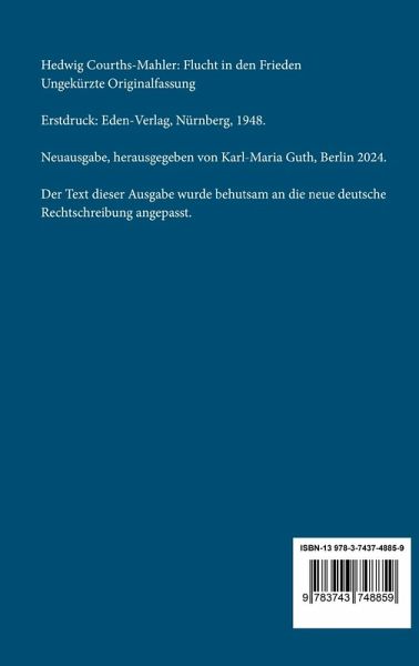 Hedwig Courths-Mahler: Flucht in den Frieden. Ungekürzte Originalfassung Erstdruck: Eden-Verlag, Nürnberg, 1948. Neuausgabe, herausgegeben von Karl-Maria Guth, Berlin 2024. Der Text dieser Ausgabe wurde behutsam an die neue deutsche Rechtschreibung angepasst. Gesetzt aus der Minion Pro, 11 pt. Henricus - Edition Deutsche Klassik GmbH