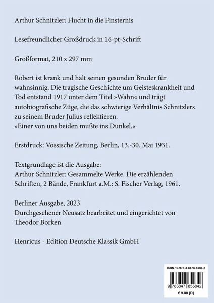 Arthur Schnitzler: Flucht in die FinsternisLesefreundlicher Großdruck in 16-pt-SchriftRobert ist krank und hält seinen gesunden Bruder für wahnsinnig. Die tragische Geschichte um Geisteskrankheit und Tod entstand 1917 unter dem Titel »Wahn« und trägt autobiografische Züge, die das schwierige Verhältnis Schnitzlers zu seinem Bruder Julius reflektieren.»Einer von uns beiden mußte ins Dunkel.«Großformat, 210 x 297 mmBerliner Ausgabe, 2023Durchgesehener Neusatz bearbeitet und eingerichtet von Theodor BorkenErstdruck: Vossische Zeitung, Berlin, 13.-30. Mai 1931.Textgrundlage ist die Ausgabe:Arthur Schnitzler: Gesammelte Werke. Die erzählenden Schriften, 2 Bände, Frankfurt a.M.: S. Fischer Verlag, 1961.Umschlagabbildung: Fritz Baumann, Nacht, 1914Gesetzt aus der Minion Pro, 16 pt.Henricus - Edition Deutsche Klassik GmbHÜber den Autor:1862 in eine begüterte jüdische Arztfamilie in Wien hineingeboren studiert Arthur Schnitzler selbst Medizin und betreibt nach kurzen Krankenhausjahren eine Privatpraxis, die er mit zunehmender literarischer Tätigkeit immer weiter reduziert. Er lernt Sigmund Freud kennen und begeistert sich für dessen Studien zum Un- und Unterbewussten. Gemeinsam mit Hugo von Hofmannsthal gilt er als Kern der »Wiener Moderne« und ist einer der bedeutendsten Kritiker seiner Zeit. Mit der Novelle »Leutnant Gustl« führt er den inneren Monolog, die seinen Figuren assoziative Reaktionen auf ihre Umwelt ermöglichen, in die deutsche Literatur ein. Seine Montagetechnik verwebt Klischees und vermeintlich individuelle Reaktionen zu einem überindividuellen Typus. Egoistische Flucht vor Verantwortung und Bindungsängste sind zentrale Themen seines umfangreichen Werkes. Nachdem ihm 1921 nach einem Skandal um seinen »Reigen« die Aufführungsgenehmigung entzogen wird, ernennt ihn der österreichische PEN-Club 1923 zu seinem Präsidenten. Drei Jahre später erhält er den Burgtheaterring und gehört zu den meistgespielten Dramatikern auf deutschen Bühnen, als er 1931 in Wien an einer Gehirnblutung stirbt.