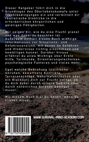 Dieser Ratgeber macht dich mit den Grundlagen der nervenaufreibenden Wirklichkeit des Überlebenskampfes unter Fluchtbedingungen vertraut und gibt dir realistische Einblicke darin, was an mentalen und physischen Fähigkeiten von dir abverlangt wird. Wir zeigen dir, wie du eine Flucht planst und was du dabei berücksichtigen musst.Außerdem lernst du aus diesem Buch Situations- und Gefahrenanalyse, wie du Gefahren und Hindernisse richtig einschätzen und meistern kannst, Erste Hilfe Kenntnisse, Tarnkunde, Orientierungstechniken, psychologische Faktoren und vieles mehr. Unabhängig davon, welche Bedrohungen (Politische Unruhen, bewaffnete Konflikte, Terroranschläge Naturkatastrophen oder ein Blackout) dich zur Flucht zwingen, egal, ob du dich dabei durch urbane Gebiete oder durch natürliches Gelände bewegen musst.Mit diesem Buch bist Du bereit, wenn du fliehen musst.