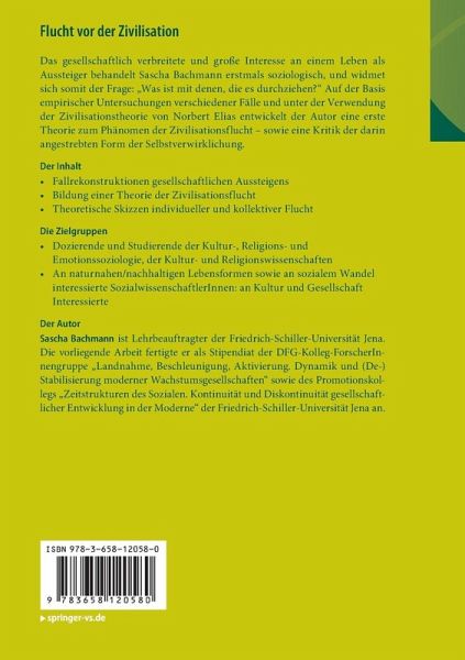 Dasgesellschaftlich verbreitete und große Interesse an einem Leben als Aussteiger behandeltSascha Bachmann erstmals soziologisch, und widmet sich somit der Frage: "Was ist mit denen, die es durchziehen?" Auf der Basisempirischer Untersuchungen verschiedener Fälle und unter der Verwendung derZivilisationstheorie von Norbert Elias entwickelt der Autor eine erste Theoriezum Phänomen der Zivilisationsflucht - sowie eine Kritik der darin angestrebtenForm der Selbstverwirklichung.