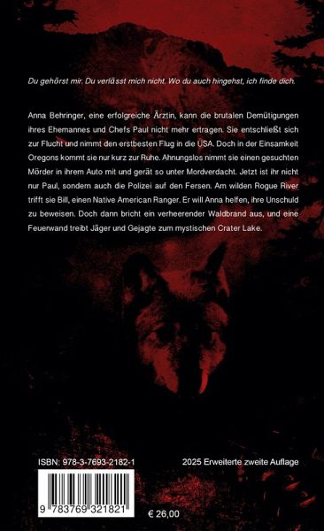 Eine mörderische Jagd durch die wilde Landschaft Oregons Anna Behringer kann die brutalen Demütigungen ihres Mannes Paul nicht mehr ertragen. Sie entschließt sich zur Flucht, doch auch in der Abgeschiedenheit Oregons kommt sie nur kurz zur Ruhe. Ahnungslos nimmt sie einen gesuchten Mörder in ihrem Auto mit und gerät so ebenfalls unter Mordverdacht. Nun ist ihr nicht nur die Polizei auf den Fersen, sondern auch Paul, der sie rachsüchtig und gnadenlos verfolgt. Ein spannender Thriller um Macht und Besitz, Flucht und Verfolgung, Liebe und Tod.