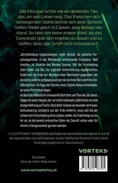 Die Morrigan schrie wie ein verletztes Tier, das um sein Leben rang. Das Kreischen sich verbiegenden Stahls bohrte sich einer glühend heißen Nadel gleich in Captain Jang Bataas Verstand. So blieb ihm keine andere Wahl, als das Crescendo über sich ergehen zu lassen und zu hoffen, dass sein Schiff nicht entzweibrach.Jahrzehntelang totgeschwiegen, rückt Skryvat, die geheime Forschungsstation, in den Mittelpunkt verheerender Ereignisse. Weit draußen, im Schatten des Mondes Sycorax, fällt die Entscheidung über Leben und Tod.Von jeglicher Unterstützung abgeschnitten, findet sich die Crew der Morrigan einer Übermacht gegenüber, der sie nichts anderes entgegenzusetzen hat als ihren Mut und ihren Einfallsreichtum. Im Auge des Sturms muss Captain Bataa entscheiden, wo seine Prioritäten liegen.An Bord des Molochs im Uranusorbit läuft Idris und Thea die Zeit davon. Gejagt von einem Gegner, der vor nichts haltmacht, bleibt ihnen nur eine einzige Hoffnung auf Flucht. Doch dafür müssen sie einander vertrauen.Achtundvierzig Lichtjahre von der Erde entfernt, muss sich Val der schwersten Entscheidung ihres Lebens stellen. Am Ende hängt es von ihr ab, ob die bereits erbrachten Opfer die Zukunft retten oder für immer in Vergessenheit geraten werden.FLUCHTPUNKT SYCORAX beinhaltet die abschließenden Bände 9 und 10 der spannenden, actionreichen und mysteriösen Science-Fiction Serie. Erstmalig ungekürzt im Taschenbuch.Einzeltitel:SkryvatKein Weg zurück