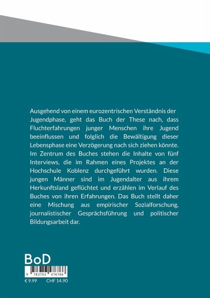 Ausgehend von einem eurozentrischen Verständnis der Jugendphase, geht das Buch der These nach, dass Fluchterfahrungen junger Menschen ihre Jugend beeinflussen und folglich die Bewältigung dieser Lebensphase eine Verzögerung nach sich ziehen könnte. Im Zentrum des Buches stehen die Inhalte von fünf Interviews, die im Rahmen eines Projektes an der Hochschule Koblenz durchgeführt wurden. Diese jungen Männer sind im Jugendalter aus ihrem Herkunftsland geflüchtet und erzählen im Verlauf des Buches von ihren Erfahrungen. Das Buch stellt daher eine Mischung aus empirischer Sozialforschung, journalistischer Gesprächsführung und politischer Bildungsarbeit dar.
