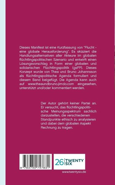 Dieses Manifest ist eine Kurzfassung von "Flucht - eine globale Herausforderung". Es skizziert die Handlungsalternativen aller Akteure im globalen flüchtlingspolitischen Szenario auf: Der Bedrohten, der Flüchtenden, der Bürger und Politiker, der Gesellschaften und Staaten sowie der Staatengemeinschaft und ihrer Organisationen. Alle befinden sich in einem wie auch immer gearteten Dilemma, in dem ihr ethisches Profil gefordert wird. Dabei geht es um das Wohl von hunderten Millionen von Menschen, insbesondere natürlich um die 65 Millionen auf der Flucht, aber auch um die Bürger in den Aufnahmeländern, die von der Entwicklung mitunter stark gefordert, manchmal sogar überlastet werden. Die besseren Wege aus den Dilemmas lassen sich nicht mit Polemik, Intoleranz und Gewalt finden, sondern nur im sachlichen, respektvollen Diskurs. Dazu soll dieses Manifest einen Beitrag leisten, indem es dem Leser einen schnellen Zugang zum Konzept des Autors verschafft.