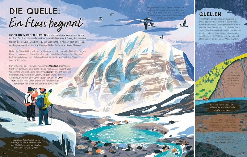 Flüsse fließen auf allen Kontinenten unseres Planeten, sie formen Landschaften, legen den Grundstein für Städte, erzeugen Energie, erschaffen Leben und sind Orte der Artenvielfalt. Dieses bunt illustrierte Natursachbuch folgt dem Flusslauf und nimmt dich mit flussabwärts. Verfolge die unglaubliche Reise eines Flusses von seiner Quelle hoch oben in den Bergen, hinunter zu seinen Wasserfällen, durch seine Schluchten und Täler, entlang an Städten und Dörfern bis zu seiner Mündung ins Meer. Auf dem Weg lernst du alles über die Entstehung von Flüssen und wie der Wasserkreislauf funktioniert, welche Tiere in Flüssen und an ihren Ufern zu finden sind, wie die Kraft des Wassers ganze Landschaften formen und sogar Energie erzeugen kann und welche Bedeutung Flüsse seit Jahrhunderten für die Zivilisation haben.
