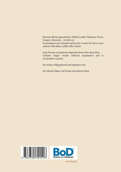 Fantasievolle Kurzgeschichten, lebhaft erzählt. Dämonen, Wesen, Vampire, Mysterien...Ich liebe es!Faszinationen neu erfunden und kreativ. Lassen Sie sich in einer anderen Welt fallen, erfüllt voller Zauber.Auch Poesien und geheime Begierden haben hier ihren Platz.Geheime Ängste werden raffiniert ausspioniert und in Geschichten verpackt.Sie werden völlig gefesselt und begeistert sein.Ich wünsche Ihnen viel Freude mit meinem Buch.