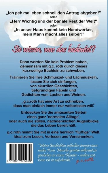 Haben Sie jemals versucht, es einem deutschen Beamten Recht zu machen?Haben Sie jemals versucht, mit drei kleinen Kindern einen unbeschwerten Vormittag im Schwimmbad zu verbringen?Oder haben Sie jemals versucht, im Baumarkt eine telefonische Auskunft zu bekommen?Dann wissen Sie wahrscheinich, wie schnell einem das Lachen vergehen kann.Trainieren Sie Ihre Schmunzel- und Lachmuskeln, lassen Sie sich einfangen, von skurrilen Geschichten, tiefgründigen Fabeln, und Gedichten vom Lachen und vom Weinen.Entdecken Sie die amüsanten Seiten eines ganz 'normalen Alltags', oder auch die stillen, nachdenklichen ugenblicke, die das Leben bereit hält.g.c.roth nimmt Sie mit in eine herrlich "fluffige" Welt.Ideal zum Lesen, Vorlesen und Verschenken.Leserstimme: "g.c.roth hat eine Art zu schreiben, dass man einfach immer nur weiterlesen will." "Meine Kurzgeschichten enthalten immer einen realen Kern. Manche geraten während sie geschehen zum Desaster, andere erst, wenn ich sie aufschreibe", so g.c.roth, ostfriesische Autorin, die dem ganz normalen Wahnsinn, dem wir täglich überall begegnen, fast immer auch eine heitere Seite abgewinnen kann. Und weil die Geschichten jedem von uns ganz genau so auch passieren könnten, macht dieses Buch so viel Spaß.