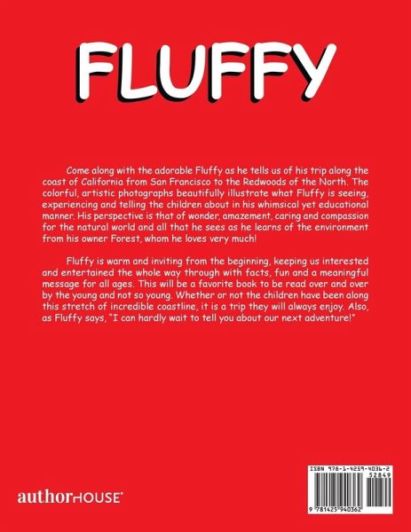 Come along with the adorable Fluffy as he tells us of his trip along the coast of California from San Francisco to the Redwoods of the North. The colorful, artistic photographs beautifully illustrate what Fluffy is seeing, experiencing and telling the children about in his whimsical yet educational manner. His perspective is that of wonder, amazement, caring and compassion for the natural world and all that he sees as he learns of the environment from his owner Forest, whom he loves very much! Fluffy is warm and inviting from the beginning, keeping us interested and entertained the whole way through with facts, fun and a meaningful message for all ages. This will be a favorite book to be read over and over by the young and not so young. Whether or not the children have been along this stretch of incredible coastline, it is a trip they will always enjoy. Also, as Fluffy says, "I can hardly wait to tell you about our next adventure!"