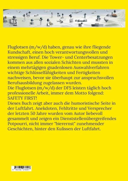 Fluglotsen (m/w/d) haben, genau wie ihre fliegende Kundschaft, einen hoch verantwortungsvollen und stressigen Beruf. Die Tower- und Centerbesatzungen kommen aus allen sozialen Schichten und mussten in einem mehrtägigen gnadenlosen Auswahlverfahren wichtige Schlüsselfähigkeiten und Fertigkeiten nachweisen, bevor sie überhaupt zur anspruchsvollen Berufsausbildung zugelassen wurden. Die Fluglotsen (m/w/d) der DFS leisten täglich hoch professionelle Arbeit, immer dem Motto folgend: SAFETY FIRST! Dieses Buch zeigt aber auch die humoristische Seite in der Luftfahrt. Anekdoten, Fehltritte und Versprecher der letzten 50 Jahre wurden vom Autor liebevoll gesammelt und zeigen ein Dienststellenübergreifendes Potpourri, nicht immer "bierernst" zunehmender Geschichten, hinter den Kulissen der Luftfahrt.
