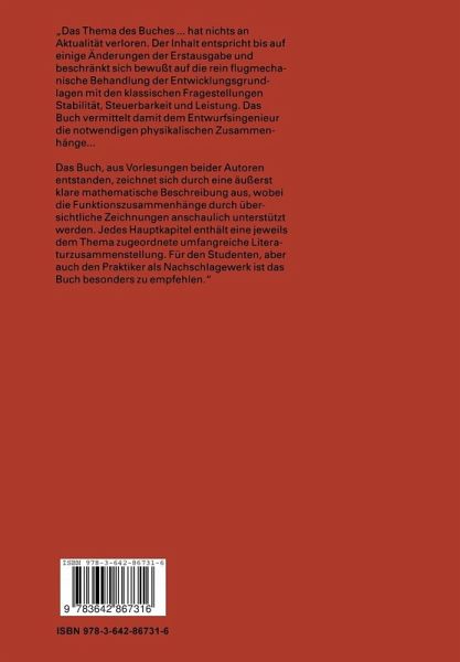 "Das Thema des Buches ... hat nichts an Aktualität verloren. Der Inhalt entspricht bis auf einige Änderungen der Erstausgabe und beschränkt sich bewußt auf die rein flugmechanische Behandlung der Entwicklungsgrundlagen mit den klassischen Fragestellungen Stabilität, Steuerbarkeit und Leistung. Das Buch vermittelt damit dem Entwurfsingenieur die notwendigen physikalischen Zusammenhänge... Das Buch, aus Vorlesungen beider Autoren entstanden, zeichnet sich durch eine äußerst klare mathematische Beschreibung aus, wobei die Funktionszusammenhänge durch übersichtliche Zeichnungen anschaulich unterstützt werden. Jedes Hauptkapitel enthält eine jeweils dem Thema zugeordnete umfangreiche Literaturzusammenstellung. Für den Studenten, aber auch den Praktiker als Nachschlagewerk ist das Buch besonders zu empfehlen." #Zeitschrift für Flugwissenschaften und Weltraumforschung#1