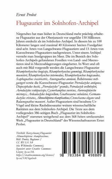 Nirgendwo hat man bisher in Deutschland mehr prächtig erhaltene Flugsaurier aus der Oberjurazeit vor ungefähr 150 Millionen Jahren entdeckt als im Solnhofen-Archipel. In diesem bis zu 100 Kilometer langen und maximal 40 Kilometer breiten Fundgebiet sind acht Arten von Langschwanz-Flugsauriern und 13 Arten von Kurzschwanz-Flugsauriern nachgewiesen. Unter einem Archipel versteht man Inselgruppen im Meer. Die im Bereich des Solnhofen-Archipels gefundenen Fossilien von Land- und Meerestieren sind in Meeresablagerungen eingebettet. In Wort und oft auch mit Bild vorgestellt werden die Langschwanz-Flugsaurier Rhamphorhynchus longiceps, Rhamphorhynchus gemmingi, Rhamphorhynchus muensteri, Rhamphorhynchus intermedius, Rhamphorhynchus longicaudus, Scaphognathus crassirostris, Anurognathus ammoni, Bellubrunnus rothgaengeri sowie die Kurzschwanz-Flugsaurier Pterodactylus antiquus, Diopecephalus kochi, "Pterodactylus" grandis, Petrodactyle wellnhoferi, Aerodactylus scolopaciceps, Cycnorhamphus suevicus, Aurorazhdarcho micronyx, Ardeadaclylus longicollum, Gnathosaurus subulatus, Germanodactylus cristatus, Altmuehlopterus rhamphastinus, Ctenochasma elegans und Balaenognathus maeuseri. Außer Flugsauriern sind bezahnte Ur-Vögel und kleine Raubdinosaurier weitere wissenschaftliche Raritäten aus dem Solnhofen-Archipel. Die Texte aus dem vorliegenden 386-seitigen Buch "Flugsaurier im Solnhofen-Archipel" stammen weitgehend aus dem 568 Seiten umfassenden Werk "Flugsaurier in Deutschland" des Wissenschaftsautors Ernst Probst.