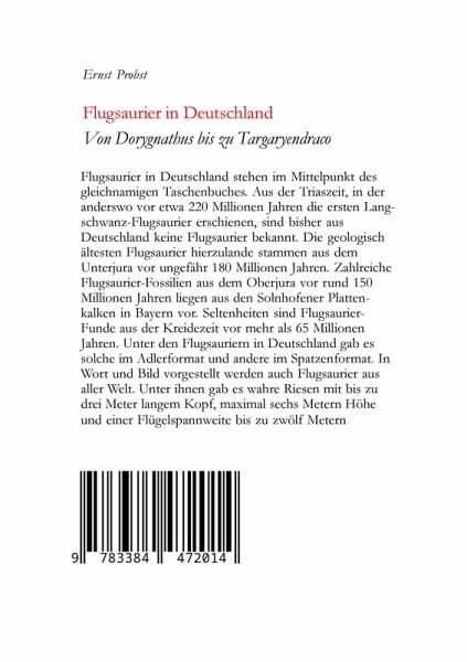 Flugsaurier in Deutschland stehen im Mittelpunkt des gleichnamigen Taschenbuches. Aus der Triaszeit, in der anderswo vor etwa 220 Millionen Jahren die ersten Langschwanz-Flugsaurier erschienen, sind bisher aus Deutschland keine Flugsaurier bekannt. Die geologisch ältesten Flugsaurier hierzulande stammen aus dem Unterjura vor ungefähr 180 Millionen Jahren. Zahlreiche Flugsaurier-Fossilien aus dem Oberjura vor rund 150 Millionen Jahren liegen aus den Solnhofener Plattenkalken in Bayern vor. Seltenheiten sind Flugsaurier-Funde aus der Kreidezeit vor mehr als 65 Millionen Jahren. Unter den Flugsauriern in Deutschland gab es solche im Adlerformat und andere im Spatzenformat. In Wort und Bild vorgestellt werden auch Flugsaurier aus aller Welt. Unter ihnen gab es wahre Riesen mit bis zu drei Meter Meter langem Kopf, maximal sechs Metern Höhe und einer Flügelspannweite bis zu zwölf Metern.
