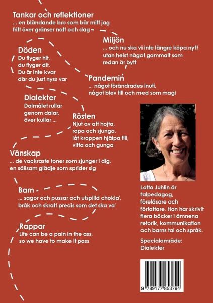 Lyrik med humor och eftertanke. Reflektioner och tankar i verser och rappar om vänskap, dialekter, barn, hus, kärlek, jul, miljö, ungdom, döden, stolar, ålderdom, röst, drömmar, sömn mm.