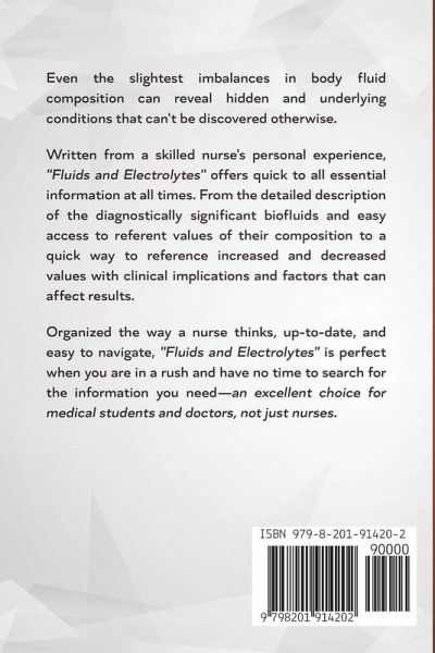 Discover the Practical Way to Learn or Refresh Your Medical Knowledge About Biofluids and Electrolytes! Biofluids are one of the main components of the body's metabolical and regulatory mechanisms that regulate homeostasis. Their circulation, composition, and style of activities vary, so it is necessary to study the mode of circulation and what these changes in body fluids imply in reality. Even the slightest imbalances in body fluid composition can reveal hidden and underlying conditions that can't be discovered otherwise. That is why it's important to know at all times what every deviation means. Since it is impossible to store every bit of information in your brain, you might need quick access to such information - that's what this practical guide offers. This guide is written from a skilled nurse's personal experience so that you can have easy access to all essential information at all times. Organized the way a nurse thinks, upto- date, and easy to navigate. Perfect when you are in a rush and have no time to search for the information you need-an excellent choice for medical students and doctors, not just nurses. Here is what this practical medical handbook to body fluids can offer you:Way to refresh your knowledge on basic medical concepts regarding bodily fluids Quick access to relevant information (abbreviations, measurements, etc.) Complete information on the diagnostically significant biofluids Easy access to referent values of their composition - serum sodium, chloride, potassium, calcium, etc. Easy way to reference increased and decreased values with clinical implications and factors that can affect results Quick way to review or update yourself on some concepts and procedures And much more!