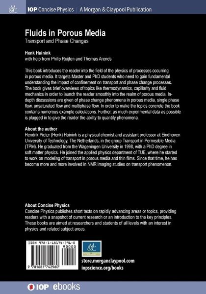 This book introduces the reader into the field of the physics of processes occurring in porous media. It targets Master and PhD students who need to gain fundamental understanding the impact of confinement on transport and phase change processes. The book gives brief overviews of topics like thermodynamics, capillarity and fluid mechanics in order to launch the reader smoothly into the realm of porous media. In-depth discussions are given of phase change phenomena in porous media, single phase flow, unsaturated flow and multiphase flow. In order to make the topics concrete the book contains numerous example calculations. Further, as much experimental data as possible is plugged in to give the reader the ability to quantify phenomena.