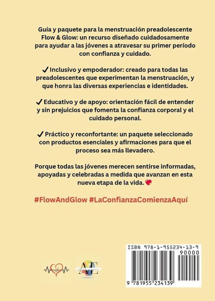 La guía menstrual Flow & Glow se creó para garantizar que las estudiantes se sientan empoderadas, informadas y seguras durante esta importante etapa de su desarrollo. Creada con un tono lúdico y terapéutico, es divertida, reconfortante y empoderadora para las preadolescentes. Un recurso cuidadosamente diseñado para apoyar a las jóvenes durante su primera menstruación con confianza y cuidado.¿ Inclusiva y empoderadora: Creada para todas las preadolescentes que experimentan la menstruación, honrando diversas experiencias e identidades.¿ Educativa y de apoyo: Guía fácil de entender y sin prejuicios que fomenta la confianza corporal y el autocuidado.¿ Práctico y reconfortante: Un paquete cuidadosamente seleccionado con productos esenciales y afirmaciones para facilitar el proceso.