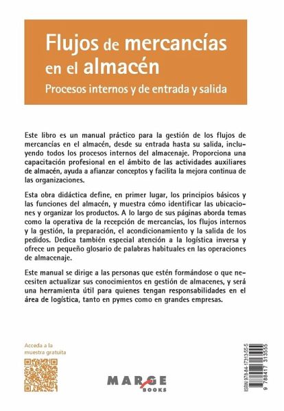 Formación en operativas internas de almacenaje de mercancías Este libro es un manual práctico para la gestión de los flujos de mercancías en el almacén, desde su entrada hasta su salida, incluyendo todos los procesos internos del almacenaje. Proporciona una capacitación profesional en el ámbito de las actividades auxiliares de almacén, ayuda a afianzar conceptos y facilita la mejora continua de las organizaciones. Esta obra didáctica define, en primer lugar, los principios básicos y las funciones del almacén, y muestra cómo identificar las ubicaciones y organizar los productos. A lo largo de sus páginas aborda temas como la operativa de la recepción de mercancías, los flujos internos y la gestión, la preparación, el acondicionamiento y la salida de los pedidos. Dedica también especial atención a la logística inversa y ofrece un pequeño glosario de palabras habituales en las operaciones de almacenaje. Este manual se dirige a las personas que estén formándose o que necesiten actualizar sus conocimientos en gestión de almacenes, y será una herramienta útil para quienes tengan responsabilidades en el área de logística, tanto en pymes como en grandes empresas. Herramientas para gestionar flujos de mercancías. Algoritmos con los conceptos clave en cada materia. Apoyo didáctico para la capacitación profesional. Esquemas y glosario para la formación.