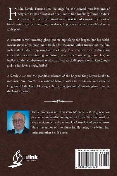 Fluke Family Fortune sets the stage for the comical misadventures of Maynerd Fluke Dumsted who sets out to find his family fortune hidden somewhere in the cursed kingdom of Gnat in order to win the heart of his shrewish lady love, Sue Tew, but that task proves to be more trouble than he anticipates. A sometimes well-meaning ghost gnome tags along for laughs, but his selfish machinations often mean more trouble for Maynerd. Other friends join the fun, such as the lovable five-year-old orphan Dandy May, who cavorts with dandelion fairies; the head-bashing ogress Grissel, who hates songs sung about her; an ineffectual thousand-year-old madman; a retired clodhopper named Sam Simple and his fun loving mule, Jazibell. A family curse and the grandiose schemes of the brigand King Kryan Kruke to transform him into the new national hero, in order to reunite the four scattered kingdoms of the land of Gnaught, further complicates Maynerd's plans to locate the family fortune.