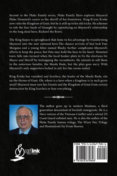 Second in the Fluke Family series, Fluke Family Hero explores Maynerd Fluke Dumsted’s career as the sheriff of his hometown. King Kryan Kruke now rules the Kingdom of Gnat, but he is still up to his old tricks. He schemes to rule the four lands of Gnaught by capitalizing on Maynerd’s relationship to the long dead hero, Richard the Brave. The King hopes to springboard that fame to his advantage by transforming Maynerd into the new national hero.The chance arrivals of bad luck Fata Morgana and a young felon named Blacky further complicates Maynerd’s efforts to keep the peace, but Fata may hold the keys to his heart. Dumsted town falls into turmoil when the local banker plots to fix the elections for Mayor and Sheriff by kidnapping the incumbents. He intends to sell them to the notorious bandits, the Moola Rude, but the plan goes awry. With Maynerd’s only supporters locked in jail, his fate seems sealed.