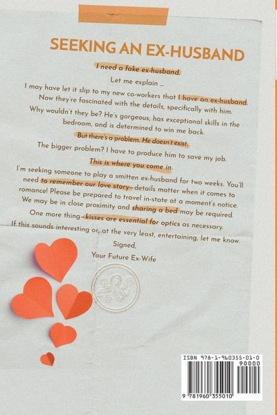 SEEKING AN EX-HUSBAND I need a fake ex-husband. Let me explain ... I may have let it slip to my new co-workers that I have an ex-husband. Now they're fascinated with the details, specifically with him. Why wouldn't they be? He's gorgeous, has exceptional skills in the bedroom, and is determined to win me back. But there's a problem. He doesn't exist. The bigger problem? I have to produce him to save my job. This is where you come in. I'm seeking someone to play a smitten ex-husband for two weeks. You'll need to remember our love story-details matter when it comes to romance! Please be prepared…mehr
