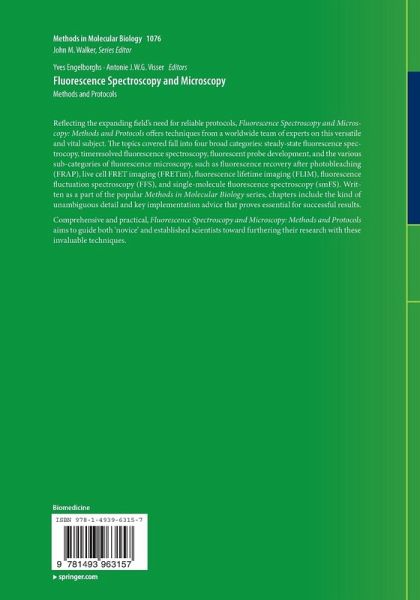Part I: Steady-State Fluorescence Spectroscopy (SSFS). How to Collect National Institute of Standards and Technology (NIST) Traceable Fluorescence Excitation and Emission Spectra.- Steady State Fluorescence Polarization/Anisotropy for the Study of Protein Interactions.- Quantitative Fluorescence Spectral Analysis of Protein Denaturation.- High-Pressure Fluorescence Applications.- Part II: Time-Resolved Fluorescence Spectroscopy (TRFS). Frequency Domain Fluorometry: Theory and Application.- Polar Plot Representation of Time-Resolved Fluorescence.- Ensemble and Single Molecule Detected Time Resolved FRET Methods in Studies of Protein Conformations and Dynamics.- MD + QM Correlations with Tryptophan Fluorescence Spectral Shifts and Lifetimes.- Analysis of Time-Dependent Red Shifts in Fluorescence Emission from Tryptophan Residues in Proteins.- Global Analysis of Time-Resolved Fluorescence Data.- Nanometrology.- Upconversion Spectrophotofluorometry.- Subpicosecond Kerr-Gate Spectrofluorometry.- Photo-Induced Electron Transfer Modeling to Simulate Flavoprotein Fluorescence Decay.- Part III: Fluorescent Probe Development (FPD). Biosynthetic Incorporation of Trp Analogs in Proteins.- Optimization of Fluorescent Proteins.- Monitoring Membrane Properties and Apoptosis Using Membrane Probes of the 3-Hydroxyflavone Family.- Part IV: Fluorescence Microscopy: Fluorescence Recovery After Photobleaching (FRAP). Rectangle FRAP for Measuring Diffusion with a Laser Scanning Microscope.- Part V: Fluorescence Microscopy: Förster Resonance Energy Transfer Imaging (FRETim). A Quantitative Protocol for Intensity-Based Live Cell FRET Imaging.- Part VI: Fluorescence Microscopy: Fluorescence Lifetime Imaging(FLIM). Widefield Fluorescence Lifetime Imaging with Multi-Anode Detectors.- Global Analysis of FRET- FLIM Data in Live Plant Cells.- Time-Resolved Fluorescence Anisotropy Imaging.- Multi-Modal Fluorescence Imaging Spectroscopy.- Part VII: Fluorescence Microscopy: Fluorescence Fluctuation Spectroscopy (FFS). Application of Fluorescence Correlation Spectroscopy (FCS) to Measure the Dynamics of Fluorescent Proteins in Living Cells.- Fluorescence Cross-Correlation Spectroscopy (FCCS) in Living Cells.- Quantifying Lipid-Protein Interaction by Fluorescence Correlation Spectroscopy (FCS).- PET-FCS: Probing Rapid Structural Fluctuations of Proteins and Nucleic Acids by Single-Molecule Fluorescence Quenching.- Z-Scan Fluorescence Correlation Spectroscopy as a Tool for Diffusion Measurements in Planar Lipid Membranes.- Scanning Fluorescence Correlation Spectroscopy (SFCS) with a Scan Path Perpendicular to the Membrane Plane.- Implementation and Application of Pulsed Interleaved Excitation for Dual-Color FCS and RICS.- Quantitative Study of Protein-Protein Interactions in Live Cell by Dual Color Fluorescence Lifetime Cross-Correlation Spectroscopy.- Brightness Experiments.- Global Analysis of Autocorrelation Functions and Photon Counting Distributions in Fluorescence Fluctuation Spectroscopy.- Simulation of Autocorrelation Function and Photon Counting Distribution in Fluorescence Fluctuation Spectroscopy.- Part VIII: Fluorescence Microscopy: Single-Molecule Fluorescence Spectroscopy (smFS). Single-Molecule Fluorescence of Nucleic Acids.- Photoswitchable Fluorescent Proteins for Superresolution Fluorescence Microscopy Above the Diffraction Limit of Light.