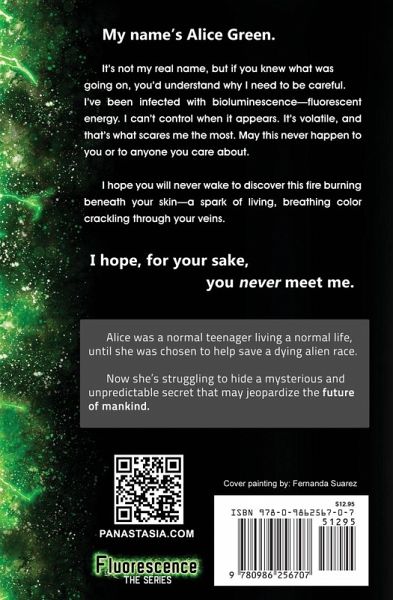 She is patient ZERO. Fluorescent light flickers in her veins. A dying alien race chose Alice to preserve its glowing DNA, and now she stands between our survival and destruction. Four victims of alien experimentation must band together to save humanity. Their time is running out... Readers are hooked on Fluorescence: "I struggled to put this book down." "I couldn't sleep! This book was so addictive!" "WOW! I couldn't read these fast enough!!" "I'm anxious to read more from this author!" "This story is amazing!" "This was easy to read. It was fun, interesting, and different from so many other science fiction books." "Drawn into this book on the first page!" "This book was so good. Deep and Interesting. I highly recommend this to anyone who likes sci-fi stories." "Addictive Series!" "Different from any science fiction book I've ever read." "Kept me reading day and night! Get the series! You won't be sorry!" "Excellent read! I couldn't put it down." "Loved it!!! Incredibly unique and tantalizing in all the right ways!" Alice was a normal teenager until a dying race of aliens chose her and a handful of others to preserve their bio-luminescent DNA. The light lives in her bloodstream, it's unpredictable and can flare up at any time. With a budding new romance on the horizon, and alien intervention threatening her future, she struggles to hide her condition from the rest of the world, while trying to learn the truth behind the infection. Readers have a hard time putting Fluorescence down. It contains hours of meddling aliens, supernatural threats, mysterious strangers, dangerous powers, and angsty teen romance. Each full-length novel in the 4-part series is narrated by a different character, driving the story forward in a new and exciting way. It evolves from a quiet beginning into a gripping series exploring the real-life limitations encountered while harboring a volatile secret. Novels in the complete Fluorescence series: Book 1: Fire Starter Book 2: Contagious Book 3: Fallout Book 4: Lost Souls