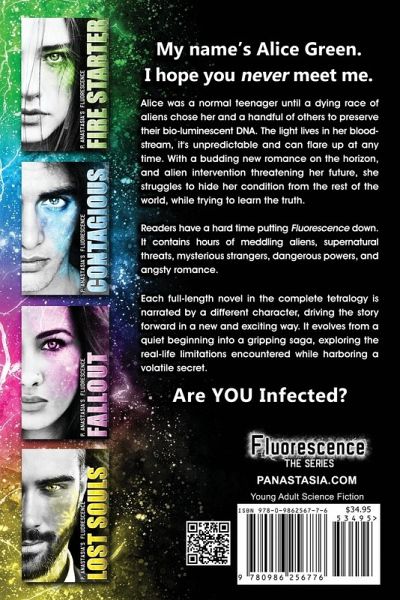 My name's Alice Green. I hope, for your sake, you never meet me. A riveting paranormal romance, Fluorescence is engaging and unabashed-a coming-of-age urban science fiction, unlike any other. It lives in her bloodstream. It's unpredictable and could flare up any time, exposing her secret. Alice was a normal teenager, until a dying race of aliens chose her and a handful of others to preserve bio-luminescent DNA, known as Fluorescence. Now, she and the others must hide their condition from the rest of the world, while trying to learn the truth behind the living light. In a unique genre, Fluorescence is a striking blend of audacious young love, fantasy, and science fiction. Each full-length novel in the complete tetralogy is narrated by a different character, driving the story forward in a new and exciting way. It evolves from a quiet beginning into a gripping saga, exploring the real-life limitations encountered while harboring a volatile secret. This Tetralogy Includes: Book 1: Fire Starter Book 2: Contagious Book 3: Fallout Book 4: Lost Souls Are YOU Infected?