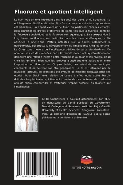 Le fluor joue un rôle important dans la santé des dents et du squelette. Il a été largement étudié et débattu. Si le fluor à des concentrations appropriées est bénéfique, un apport excessif de fluor, en particulier chez les enfants, peut entraîner de graves problèmes de santé tels que la fluorose dentaire, la fluorose squelettique et la fluorose non squelettique. La surexposition à long terme au fluorure, en particulier dans les zones endémiques, a été associée à une série d'effets néfastes sur la santé, notamment la neurotoxicité, qui affecte le développement de l'intelligence chez les enfants. Le QI est une mesure de l'intelligence dérivée de tests standardisés. De nombreuses études menées dans le monde entier ont systématiquement démontré une relation inverse entre l'exposition au fluor et les niveaux de QI chez les enfants. Bien que les preuves suggèrent une association entre l'exposition au fluor et un QI plus faible, ces résultats ne sont pas concluants et ne peuvent pas être généralisés. Le QI est influencé par de multiples facteurs, qui n'ont pas été évalués de manière adéquate dans ces études. Pour établir une relation de cause à effet, nous avons besoin d'études longitudinales qui tiennent compte de ces facteurs de confusion afin de mieux comprendre et d'atténuer l'impact potentiel du fluorure sur l'intelligence.