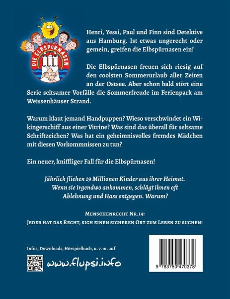 Henri, Yessi, Paul und Finn sind Detektive aus Hamburg.Ist etwas ungerecht oder gemein greifen Elbspürnasen ein!Die vier Freunde freuen sich riesig auf den coolsten Sommerurlaub aller Zeiten an der Ostsee.Schon bald stört eine Serie seltsamer Vorfälle die Sommerfreude im Ferienpark am Weissenhäuser Strand.Warum klaut jemand Handpuppen? Wieso verschwindet ein Wikingerschiff aus einer Vitrine? Was sind das überall für seltsame Schriftzeichen? Was hat ein geheimnisvolles fremdes Mädchen mit diesen Vorkommnissen zu tun?Ein neuer, kniffliger Fall für die Elbspürnasen! Eine spannende Geschichte über Toleranz, Mut und Liebe.Ab 5 Jahren bis zur 4. Klasse