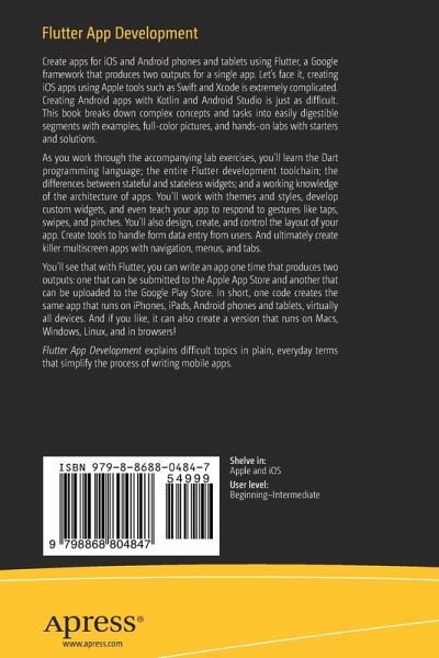 Create apps for iOS and Android phones and tablets using Flutter, a Google framework that produces two outputs for a single app. Let's face it, creating iOS apps using Apple tools such as Swift and Xcode is extremely complicated. Creating Android apps with Kotlin and Android Studio is just as difficult. This book breaks down complex concepts and tasks into easily digestible segments with examples, full-color pictures, and hands-on labs with starters and solutions.