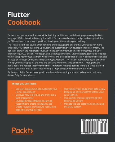 Discover how to build, scale, and debug native iOS and Android applications from a single codebase using the Dart programming language Key Features:Quickly build and iterate on your user interface (UI) with hot reload Fix bugs and prevent them from reappearing using Flutter's developer tools and test suites Discover practical recipes for building mobile applications with Flutter Book Description: Flutter is an open-source framework for building mobile, web, and desktop apps using the Dart language. With this recipe-based guide, which focuses on robust app design and core principles, you'll learn how to solve cross-platform development issues in a practical way. The Flutter Cookbook covers error handling and debugging to ensure that your apps run more efficiently. You'll start by setting up Flutter and customizing your development environment. The book will explain the main tasks involved in app development, such as user interface and user experience (UI/UX) design, API design, and creating animations. Later chapters get you up to speed with routing, retrieving data from web services, and persisting data locally. A dedicated section also focuses on Firebase and its machine learning capabilities. The last chapter is specifically designed to help you create apps for the web and desktop (Windows, Mac, and Linux). Throughout the book, you'll find recipes that cover the most important features needed to build a cross-platform application, along with insights into running a single codebase on different platforms. By the end of this Flutter book, you'll have learned everything you need to be able to write and deliver fully functional apps. What You Will Learn:Use Dart programming to customize your Flutter applications Discover how to develop and think like a Dart programmer Leverage Firebase Machine Learning capabilities to create intelligent apps Create reusable architecture that can be applied to any type of app Use web services and persist data locally Debug and solve problems before users can see them Use asynchronous programming with Future and Stream Manage the app state with Streams and the BLoC pattern Who this book is for: This app development book is for beginner to intermediate-level developers who want to become mobile developers. Basic knowledge of modern programming languages such as JavaScript, Swift, Kotlin, Java, Objective-C, or C# will help you to understand the concepts covered in the book more easily.