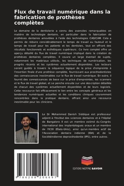 Le domaine de la dentisterie a connu des avancées remarquables en matière de technologie dentaire, en particulier dans la fabrication de prothèses dentaires amovibles à l'aide des technologies CAD/CAM. Cela a permis de réduire considérablement le temps de travail au fauteuil et le temps de travail pour les patients et les dentistes, tout en offrant des résultats fonctionnels et esthétiques supérieurs. Ce livre complet offre un aperçu détaillé du flux de travail numérique impliqué dans la création de prothèses dentaires complètes. Il couvre un large éventail de sujets, notamment les matériaux utilisés, les techniques de numérisation, les progrès récents et les systèmes actuellement disponibles. Les lecteurs seront guidés à travers la séquence logique de la prise d'empreinte à l'insertion finale d'une prothèse complète, fournissant aux prosthodontistes des connaissances inestimables sur le flux de travail numérique. En outre, il fournit des connaissances de base sur la prise d'empreintes, les scanners et le flux de travail global, et se penche ensuite sur une description détaillée de chacun des systèmes actuellement disponibles et de leurs logiciels. Cette ressource fait efficacement le lien entre les concepts généraux et les tendances numériques actuelles et les conditions cliniques couramment rencontrées dans la pratique dentaire, offrant ainsi une ressource inestimable pour les cliniciens.