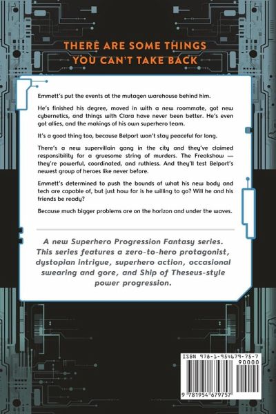 There are some things you can't take back. Emmett's put the events at the mutagen warehouse behind him. He's finished his degree, moved in with a new roommate, got new cybernetics, and things with Clara have never been better. He's even got allies, and the makings of his own superhero team. It's a good thing too, because Belport won't stay peaceful for long. There's a new supervillain gang in the city and they've claimed responsibility for a gruesome string of murders. The Freakshow-they're powerful, coordinated, and ruthless. And they'll test Belport's newest group of heroes like never before. Emmett's determined to push the bounds of what his new body and tech are capable of, but just how far is he willing to go? Will he and his friends be ready? Because much bigger problems are on the horizon and under the waves. A new Superhero Progression Fantasy series. This series features a zero-to-hero protagonist, dystopian intrigue, superhero action, occasional swearing and gore, and Ship of Theseus-style power progression.