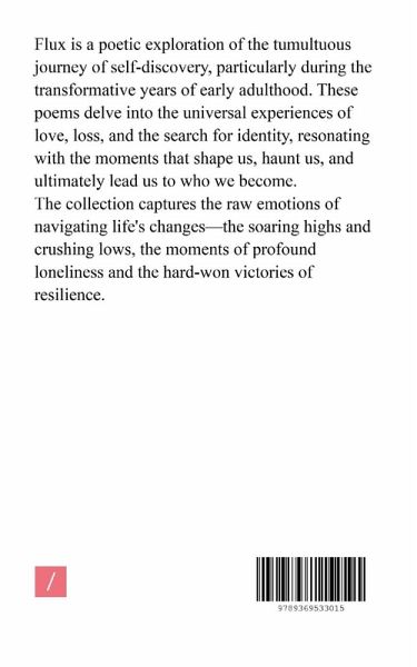 Flux is a poetic exploration of the tumultuous journey of self-discovery, particularly during the transformative years of early adulthood. These poems delve into the universal experiences of love, loss, and the search for identity, resonating with the moments that shape us, haunt us, and ultimately lead us to who we become. The collection captures the raw emotions of navigating life's changes-the soaring highs and crushing lows, the moments of profound loneliness and the hard-won victories of resilience.