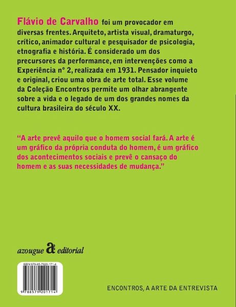 Encontros (Meetings) is the largest and most prestigious book collection of interviews with Brazilian artists and thinkers. With more than 50 published titles, Encontros provides a broad panorama of Brazil's cultural and intellectual wealth. Flávio de Carvalho was a provocateur on many fronts. Architect, visual artist, playwright, critic, cultural animator, and researcher of psychology, ethnography and history. He is considered one of the precursors of performance, with interventions such as Experiment No. 2, held in 1931. A restless and original thinker, he created a total work of art. This volume of the Encontros Collection provides a comprehensive look at the life and legacy of one of the great names of 20th century Brazilian culture.